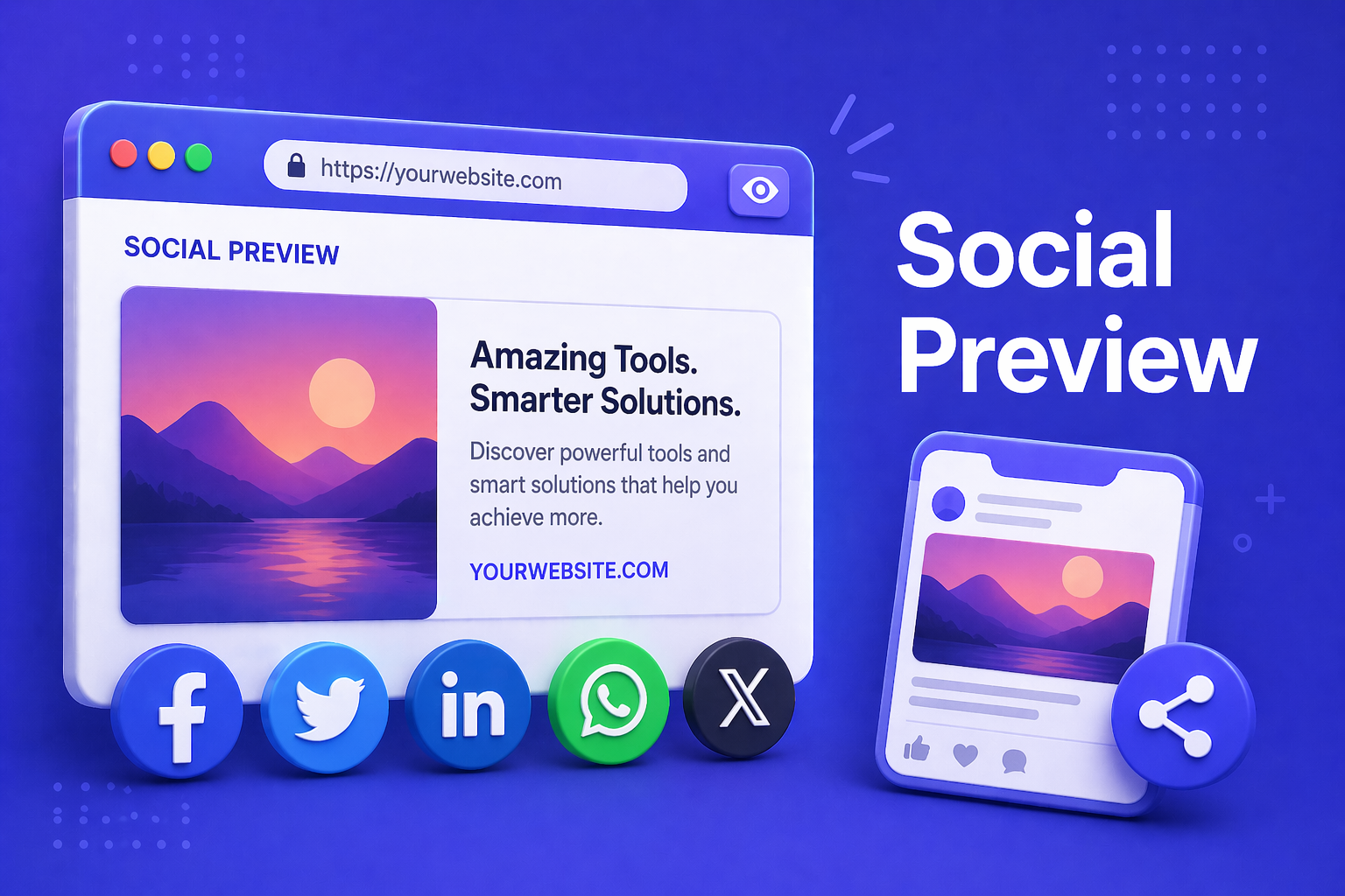 - Sechs plattformnahe Vorschaukarten: Facebook, X, LinkedIn, WhatsApp, Slack, Discord